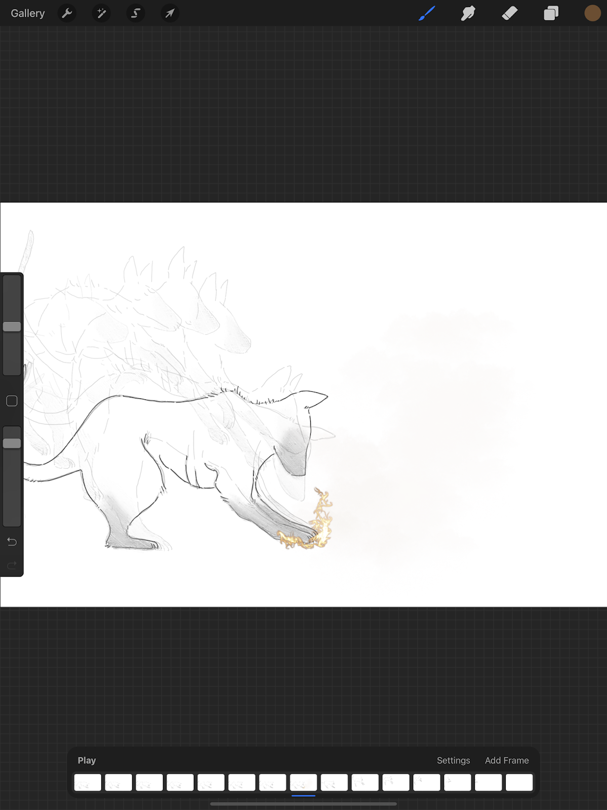 Below are a sequence of images taken as a screenshot from Procreate, which is what I’m using to animate. At the moment I am trying to figure out how I can make the smoke begin to appear from beneath the cats paws before it jumps in fright, revealing fire. As a result I am experimenting with different styles of design and drawing to figure out what would be the most aesthetic result.